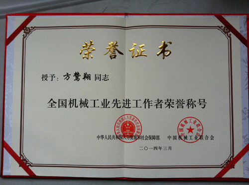 “全国机械工业先进工作者”荣誉证书