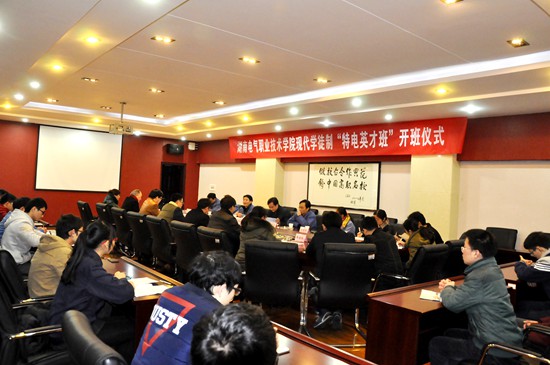 开班仪式首先由学院副院长路成志宣读学院2016(1号)文件《关于成立湖南电气职业技术学院现代学徒制“特电英才班”的决定》。随后特电事业部副总经理左志远详细介绍了特电事业部的发展历程以及目前项目实施和人才需求的情况。电气与信息工程系党总支书记李超华的发言主要对“特电英才班”的组织和选拔进行了介绍,并强调了下一步的班级管理工作。班主任周惠芳老师要求同学们不管是在学校还是在企业都要进一步加强学习,勤思多问,做好笔记。班长刘聪同学代表全班同学首先感谢集团公司和学院提供了一个良好的学习平台和实践机会,随后表态将带领全班同学,珍惜这次难得的机会,踏实学习,争取以优异的成绩回报公司和学院对自己的培养。学院副院长周哲民教授从国家对现代学徒制的顶层设计到出台的一系列政策文件都进行了详细解读,分析了当前职业教育实施现代学徒制的必要性和迫切性,并对“特电英才班”以后的各项工作作了周密的部署。最后人力资源部副部长杜伟强代表集团公司发言并表态,集团公司将尽全力支持学院和特电事业部的此次合作,并预祝此次合作取得圆满成功,同时对“特电英才班”的全体学生也表达了诚挚的祝福和殷切的期望。